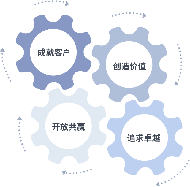 成就客户是一切决策的出发点,,,,创造价值是衡量所有工作的标准,,,,追求卓越是我们做事做人的态度,,,,开放共赢是我们的格局也是最终的结果。。价值观的齿轮环环相扣,,,,推动着组织里的每个人不断向前。。。。