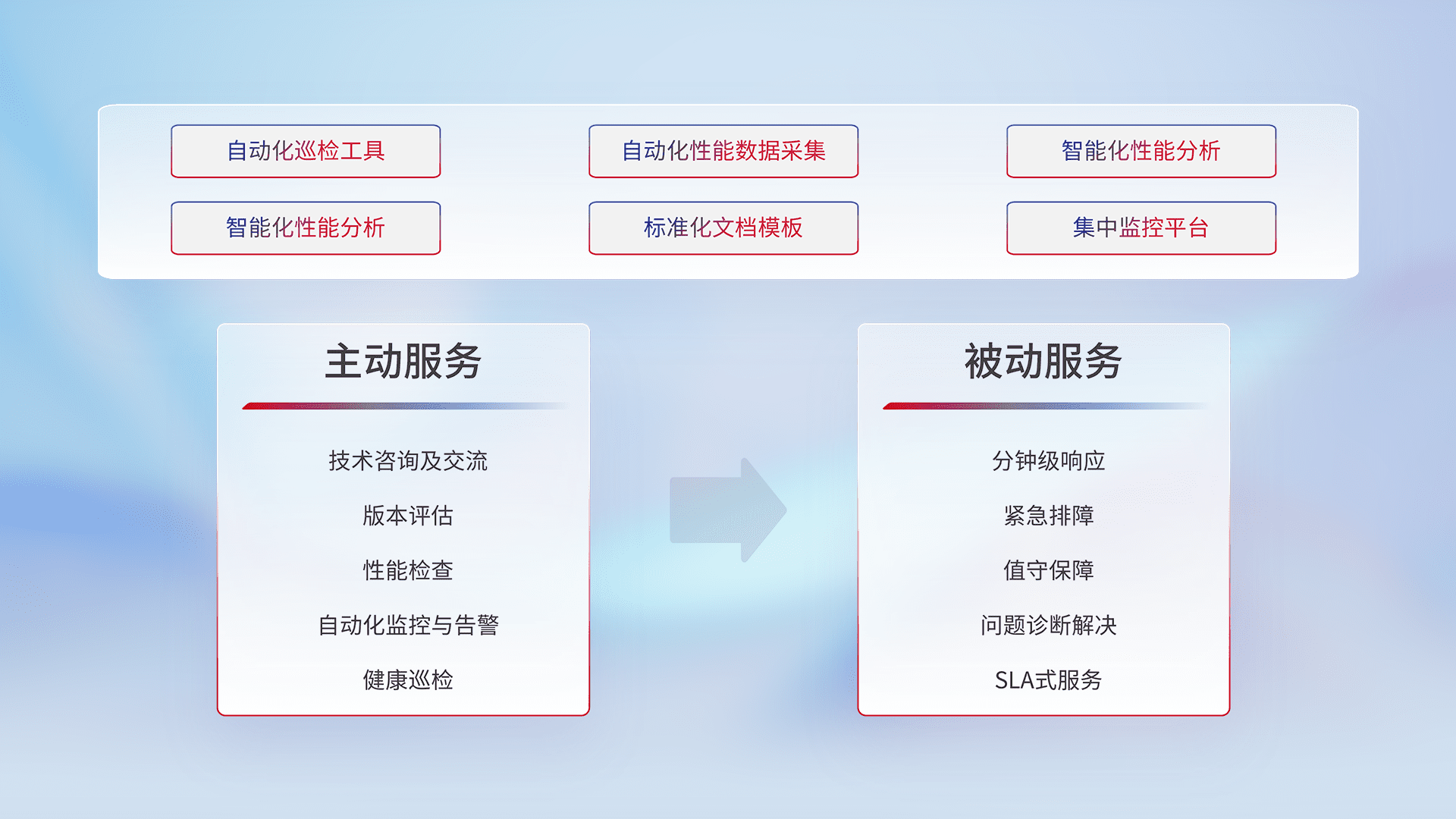 智能化工具和标准化文档,,保障服务质量,,,提供主动服务(包含技术咨询、、版本评估、、、性能检查、、、、自动化监控与告警、、健康巡检)和被动服务包含(分钟级响应、、、紧急排障、、值守保障、、问题诊断解决、、SLA服务)。。。